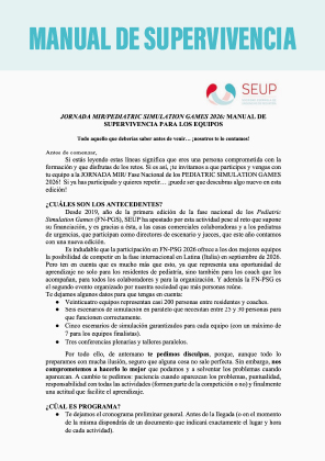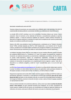 Los “Pediatric simulations games” son juegos de equipo formados por residentes de Pediatría que compiten poniéndose a prueba en el manejo de paciente pediátrico grave, soporte vital avanzado y reanimación cardiopulmonar. Nuestra Sociedad, en respuesta a la invitación que nos realizó la Sociedad Italiana de Medicina de Emergencia Pediátrica selecciona desde el año 2019 mediante un evento nacional aquellos dos equipos que nos representarán en la competición internacional.