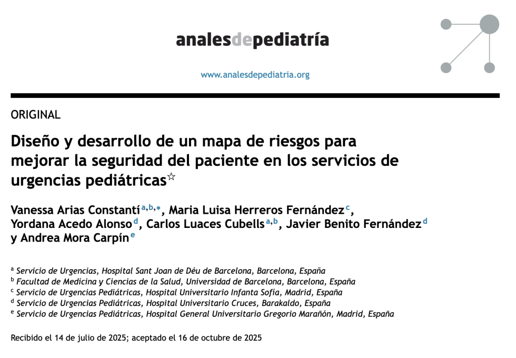 El estudio, desarrollado con participación multicéntrica de 22 hospitales, identifica 8 procesos asistenciales y 104 riesgos potenciales, y propone un Mapa de Riesgos común para facilitar una gestión proactiva de la seguridad del paciente en los Servicios de Urgencias Pediátricas.